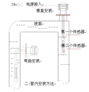 3: 管道安裝時需讓液體從最下面傳感器之下進入液體,或者從最上面傳感器的上面進入液體,不要從中間進入液體。管道安裝通液體時,管道閥門或者彎頭部分至少留出30CM液體緩沖距離。